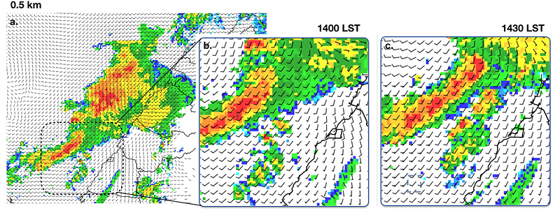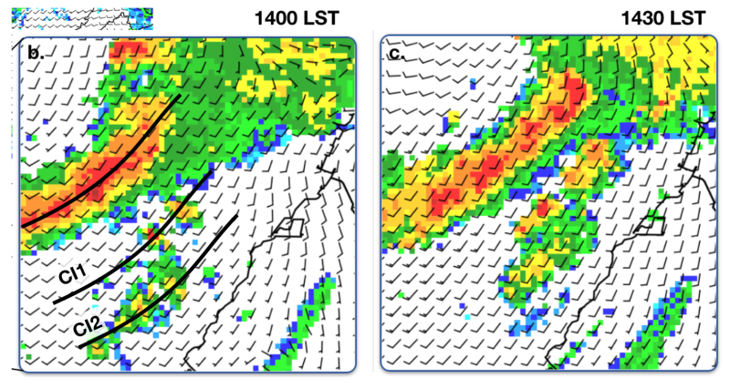 Example of secondary cell formation near convective line that is unlikely to have been induced by cold pools One of the more notable findings is the lack of defined cold air outflow emitted from the MCS. Radar-derived winds in the above figure show consistent southwesterly flow, with no signs of divergent flow anywhere. However, secondary cells were initiated at regular horizontal interval (CI1,CI2) to the southeast of the MCS. CI1 and CI2 can potentially be explained by the lifting of unstable air by trapped convectively-generated gravity waves.